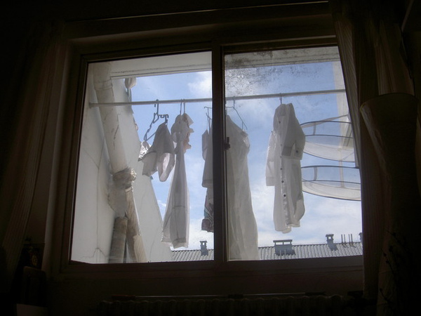 (圖說:痛得打滾時,在宿主閣樓處沙發床上看見的天空。藍天,還襯著我們女孩兒們剛洗好的白色衣服,整個看起來愉快爽目到一個矯情。可惜不能出門,但就算邊痛到冒冷汗,還是要拍下這個瞬間,難得清爽的北京夏日天空。)